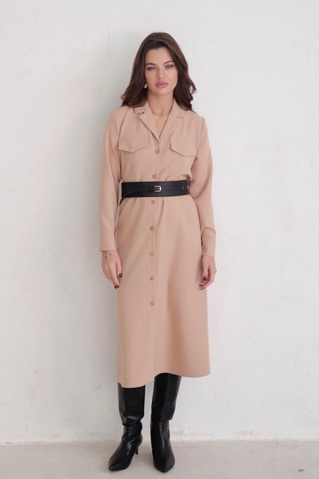 Платье-рубашка длины "миди". Застежка на пуговицы, английский воротник с лацканами, длинные рукава с манжетами на пуговицах. На груди - декоративные клапаны.