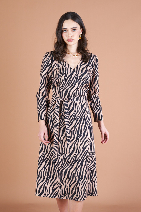 Платье с запахом фиксирующимся притачным поясом выполнено из плательной ткани. Отрезное в области талии. Лиф прилегающий. Юбка летящего силуэта. Укороченный втачной рукав со сборкой по окату.