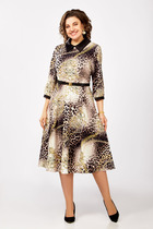 Платье приталенного силуэта из вискозной плательной ткани. Изделие отрезное по линии талии с защипами. В боковых швах карманы. Втачной короткий рукав. Притачная планка с застёжкой на пуговицы. Вырез горловины обработан отложным воротником на стойке. В комплекте пояс из основной ткани.