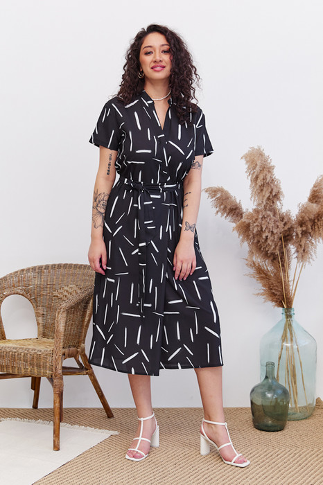 Платье свободного силуэта из плательной ткани. Изделие отрезное по линии талии с резинкой. Лиф платья с запахом, фиксируется на пуговицу для удобства. На передней части юбки выполнена складка, имитирующая запах, в боковых швах карманы. Линия горловины оформлена воротником-стойкой. Втачной короткий рукав. В комплекте пояс из основной ткани.