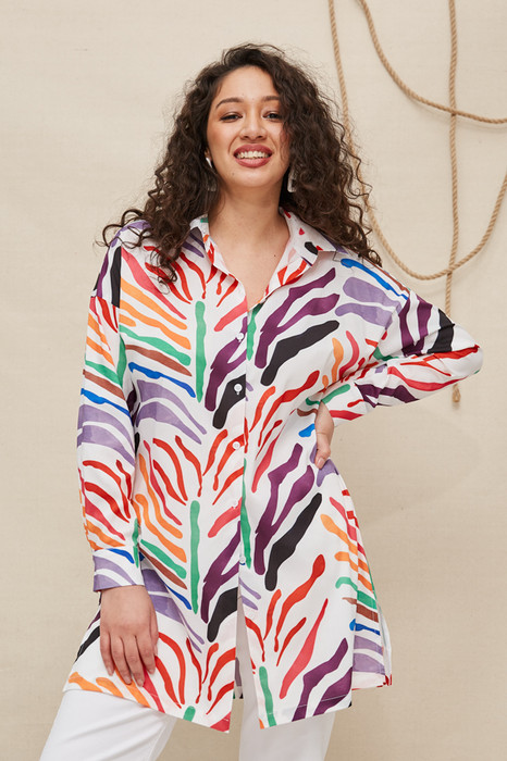 Рубашка-туника из вискозной ткани свободного силуэта с застёжкой на пуговицы. Низ изделия с разрезами по бокам. Рубашечный рукав на манжете с застёжкой на пуговицы. Вырез горловины обработан отложным воротником на стойке. На задней части изделия выполнена кокетка с небольшой складкой. Достоинство этой модели в способности скрыть некоторые недостатки фигуры.