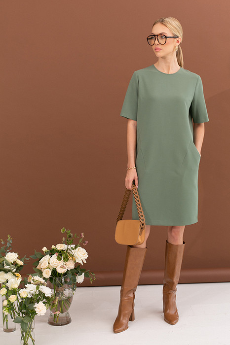 Платье свободного силуэта из плательной ткани. На передней части изделия выполнены декоративные рельефы и карманы. Втачной короткий рукав. Круглый вырез горловины, по среднему шву спинки застёжка на молнию.