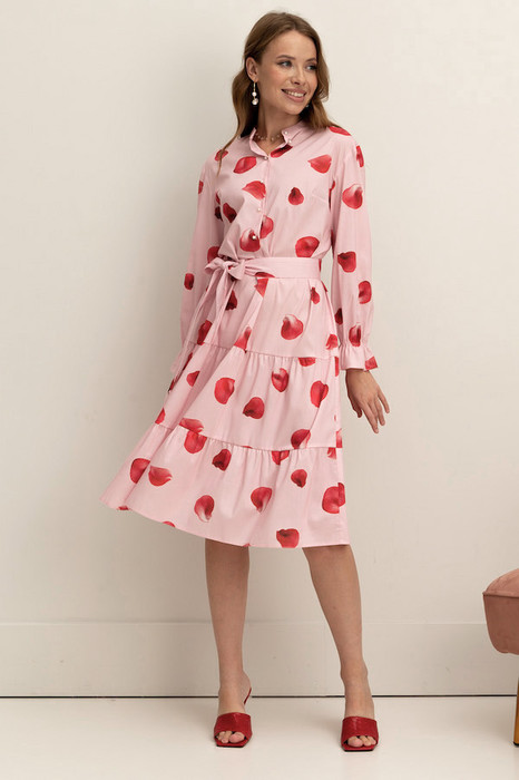 Платье свободного силуэта из вискозной плательной ткани. Изделие отрезное по линии талии, с ярусами на юбке. Лиф с застёжкой на пуговицы. Вырез горловины обработан воротником-стойкой. Втачной рукав в романтическом стиле, присборен на резинку. В комплекте пояс из основной ткани. В таблице размеров представлены параметры человека, а не изделия.