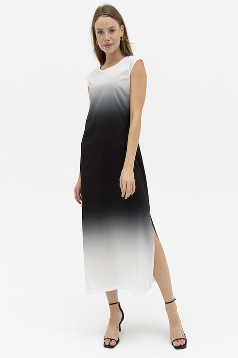 Платье из вискозной плательной ткани. Полуприлегающий силуэт, с разрезом в боковом шве. Круглый вырез горловины. По среднему шву спинки застёжка на петлю-пуговицу.