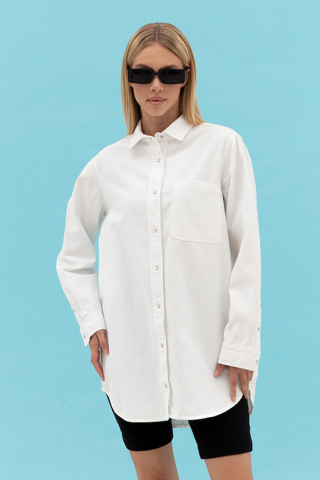 Платье-рубашка из денима выполнено по классической джинсовой технологии. Свободный силуэт с застёжкой на планке. Низ изделия с закруглениями по бокам. Рубашечный рукав на манжете с застёжкой на кнопки. Вырез горловины обработан отложным воротником на стойке. На передней части выполнен накладной карман в области груди. Швы оформлены декоративными строчками. Достоинство этой модели в способности скрыть некоторые недостатки фигуры.