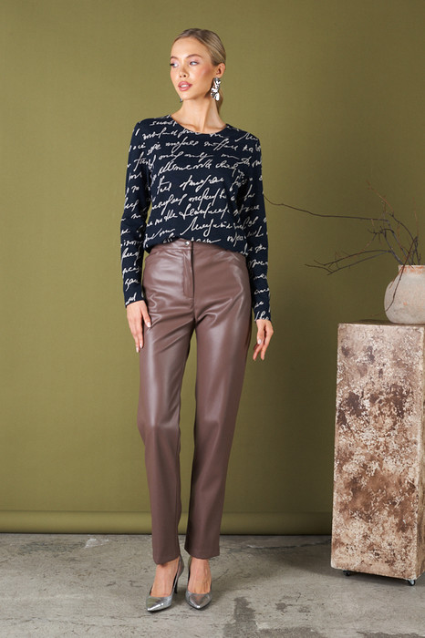 Брюки из эластичного полотна, с покрытием, имитирующим кожу, зауженные книзу. На передней части брюк карманы с подкройным бочком. Притачной пояс, застёжка на металлическую молнию-гульфик и кнопку.