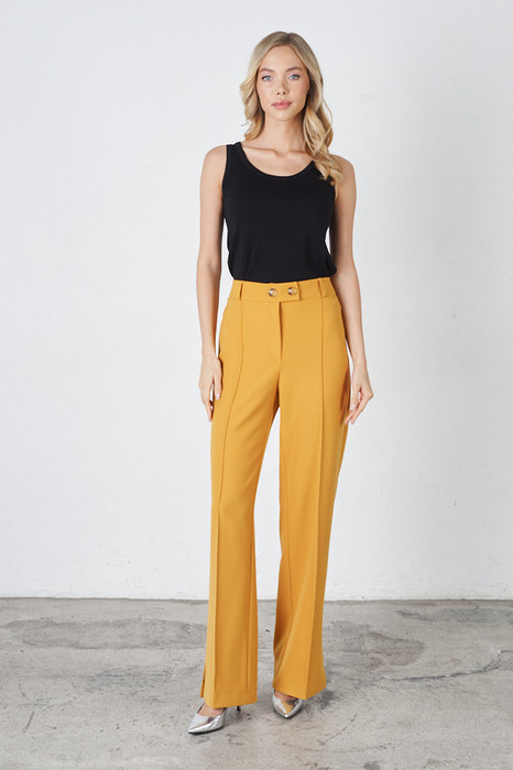 Брюки прямого силуэта, с разрезами в боковых швах из костюмной ткани. На передней части брюк застрочены стрелки. Притачной пояс со шлёвками. Застёжка на молнию-гульфик и пуговицу. Секрет такой модели кроется в безупречно точной посадке по талии и бедрам – ничего лишнего, только конструктивные детали, которые придают четкость линиям силуэта.