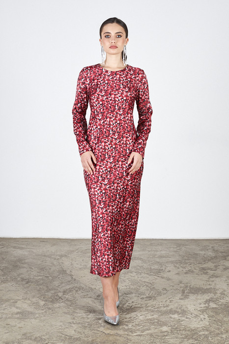 Платье прилегающего силуэта из атласной ткани. Крой платья по косой. Втачной длинный рукав. Круглый вырез горловины, сзади застёжка на петлю-пуговицу.