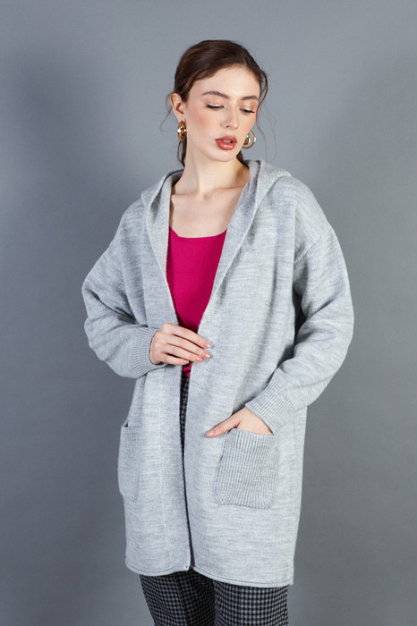 Кардиган свободного силуэта с капюшоном, со спущенной линией плеча и длинным рукавом. На передней части изделия выполнены карманы. Низ изделия и низ рукава оформлены резинкой. Изделие выполнено из мягкой меланжевой пряжи.