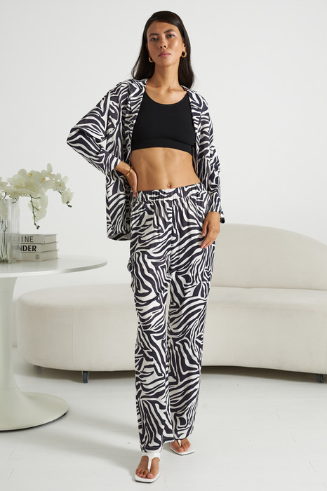 Костюм из атласной плательно-блузочной ткани. Блуза свободного силуэта с английским воротником. Английский воротник визуально сделает фигуру стройнее, скроет недостатки и подчеркнет красивую линию груди. На передней части изделия застежка на пуговицы. Втачной длинный рукав. Брюки прямого силуэта,.в боковых швах карманы. Пояс притачной с эластичной резиной.