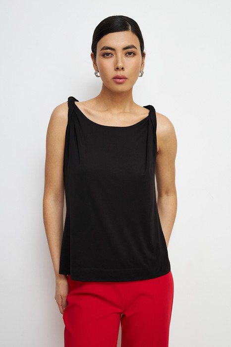 Джемпер полуприлегающего силуэта из вискозного эластичного полотна. Оригинальный крой с перекрутом на плечах. Изделие двухслойное с круглым вырезом горловины.