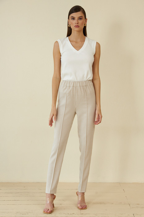 Брюки прямого силуэта, зауженные книзу из костюмной ткани. На передней части брюк застрочены стрелки. Пояс притачной с эластичной резиной.