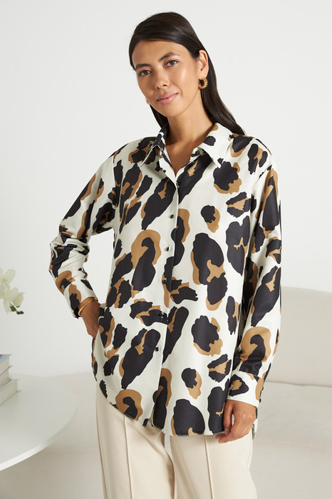 Рубашка свободного силуэта с застёжкой на пуговицы из вискозной ткани. Низ изделия асимметричной длины (спинка удлинена относительно переда) с закруглениями по бокам. Вырез горловины обработан отложным воротником на стойке. Рубашечный рукав на манжете с застёжкой на пуговицы. На задней части изделия выполнена кокетка с небольшой складкой. Достоинство этой модели - в способности скрыть некоторые недостатки фигуры. Её можно сочетать как с брюками, так и с джинсами.