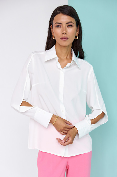 Блуза-рубашка из блузочной ткани. Свободный силуэт с застёжкой на пуговицы. Вырез горловины обработан отложным воротником на стойке. Оригинальный втачной рукав на манжете с застёжкой на пуговицы.