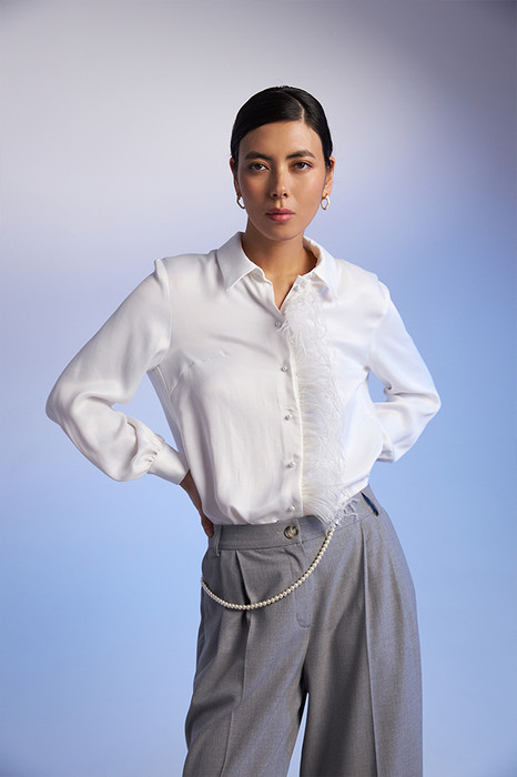 Блуза из вискозной ткани с сатиновым блеском. Свободный силуэт с разрезами в боковых швах и застёжкой на пуговицы. На задней части изделия выполнена кокетка с небольшой складкой. Вырез горловины обработан отложным воротником на стойке. Втачной рукав на манжете с застёжкой на пуговицы. Изделие украшено съемной планкой с перьями. Перед стиркой планку с перьями необходимо снять.