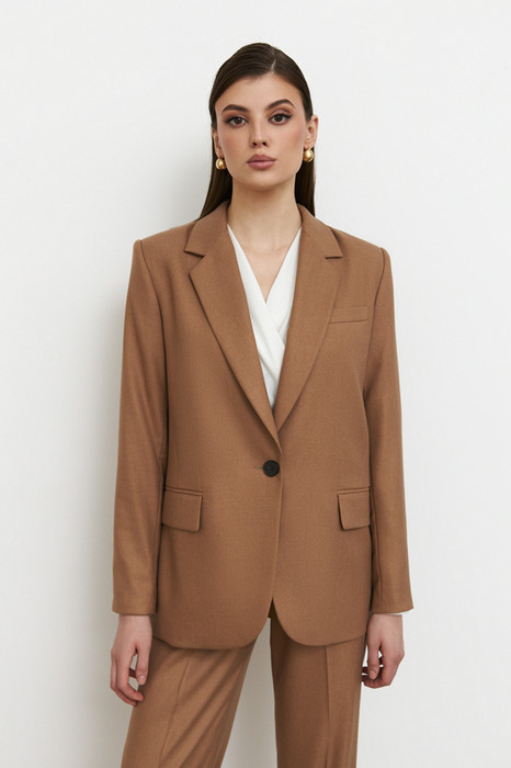 Жакет полуприлегающего силуэта из костюмной ткани. Изделие с английским воротником и застежкой на пуговицу. На передней части жакета выполнен нагрудный карман с листочкой и карманы в рамку с клапаном. По центру задней части выполнена шлица - элемент декоративный и необходимый. Обеспечивает свободу движения, добавляет шику и элегантности. Втачной длинный рукав, снизу имитация шлицы с пуговицами. Изделие идеально держит форму, имеет четкую линию плеча благодаря плечевым накладкам. Жакет на подкладке.