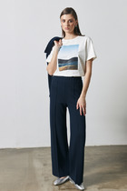 Брюки прямого силуэта из эластичного полотна. Пояс притачной с эластичной резиной. На передней части брюк застрочены стрелки.