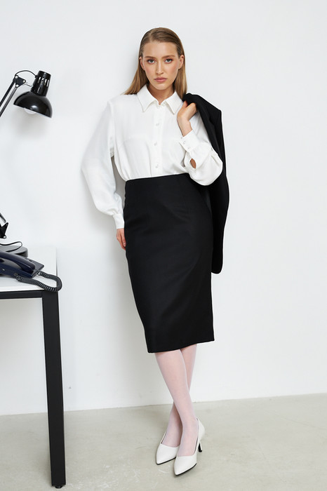 Юбка прилегающего силуэта из костюмной ткани. Сзади по среднему шву застёжка-молния, снизу шлица с разрезом. Изделие без пояса, верхний срез обработан обтачкой. На передней и задней половине юбки выполнены талиевые вытачки. Юбка на притачной подкладке.