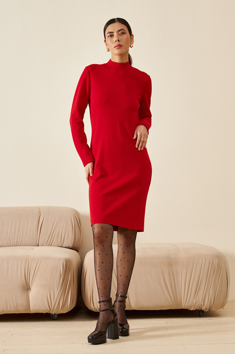 Платье из эластичного полотна. Изделие прилегающего силуэта с длинным втачным рукавом. Воротник-стойка. По среднему шву спинки застежка-молния.