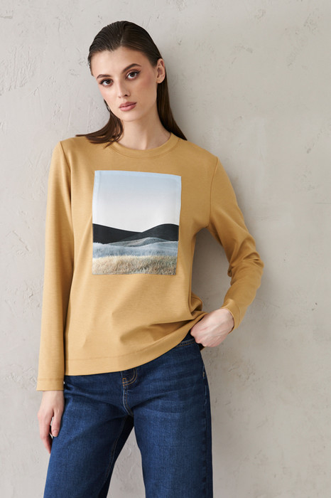 Джемпер свободного силуэта из эластичного полотна. Вырез горловины оформлен бейкой из основной ткани. На передней части изделия выполнена аппликация. Втачной длинный рукав.
