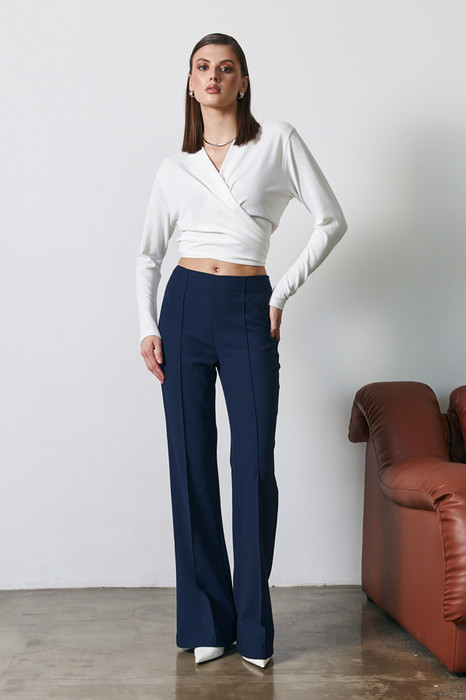 Брюки, зауженные в области колена и расклешённые книзу из костюмной ткани. На задней части брюк по талии выполнены две вытачки. На передней части застрочены стрелки. Брюки без пояса на обтачке. В боковом шве потайная молния. Низ брюк оформлен широкой подгибкой.