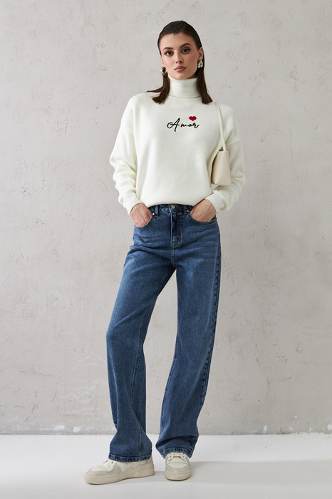 Брюки из эластичного денима выполнены по классической джинсовой технологии (варка с эффектом легкого выбеливания). Прямой классический крой. На задней части брюк выполнены накладные карманы, на передней - карманы с подкройным бочком. Притачной пояс со шлёвками. Застёжка на молнию-гульфик и пуговицу.
