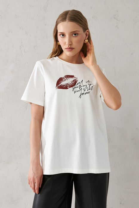 Джемпер свободного силуэта из хлопкового эластичного полотна. Втачной короткий рукав. Круглый вырез горловины оформлен бейкой. На передней части изделия нанесён принт методом шелкографии.