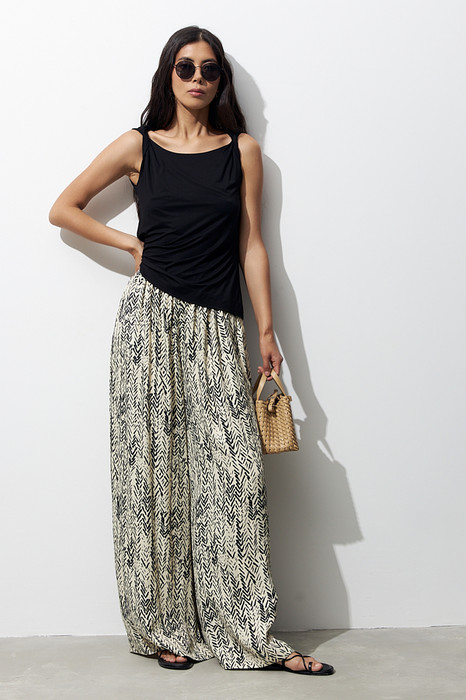Брюки прямого свободного силуэта из вискозной ткани с сатиновым блеском. Пояс притачной с эластичной резиной, в боковых швах карманы.