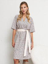 Платье полуприлегающее в области груди и свободное в области бедер из вискозной ткани. Изделие отрезное по линии талии. Лиф с застёжкой на пуговицы. Вырез горловины обработан отложным воротником на стойке. Втачной короткий рукав. В комплекте пояс из основной ткани.