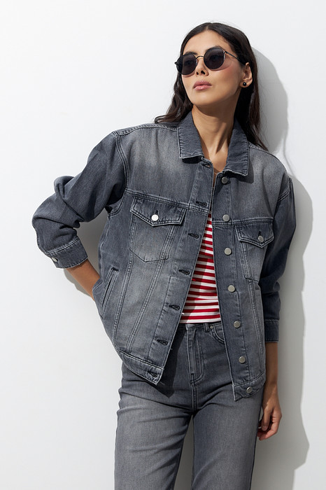 Джисовая куртка из денима выполнена по классической джинсовой технологии. Свободный силуэт с застёжкой на пуговицы. Изделие со спущенной линией плеча и длинным рукавом на манжете с застёжкой на пуговицы. Вырез горловины обработан отложным воротником на стойке. На передней части выполнены карманы с листочкой и накладные карманы с клапаном в области груди. Швы оформлены декоративными строчками.