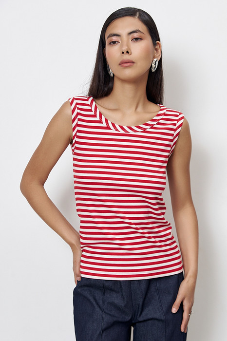 Топ из эластичного полотна полуприлегающего силуэта. Линия горловины и линия проймы окантованы эластичной бейкой.