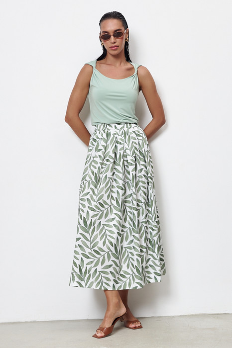 Юбка из вискозной ткани свободного силуэта со складками по линии талии. Пояс с эластичной резиной.