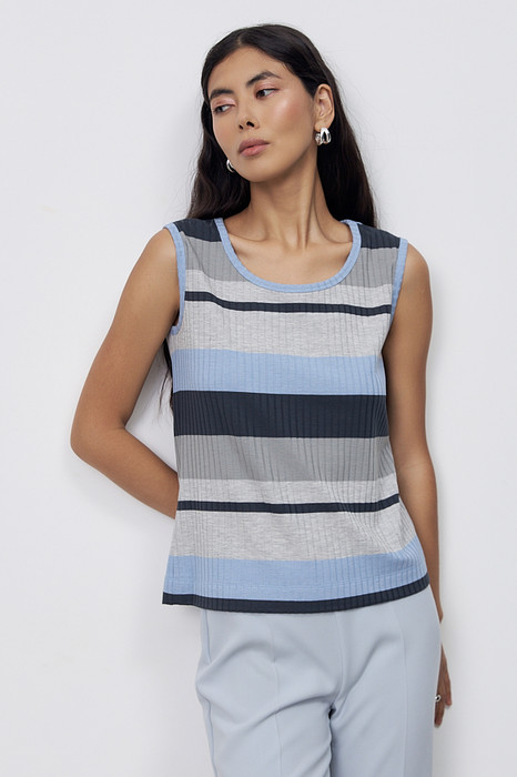 Топ из эластичного полотна полуприлегающего силуэта. Линия горловины и линия проймы окантованы эластичной бейкой.
