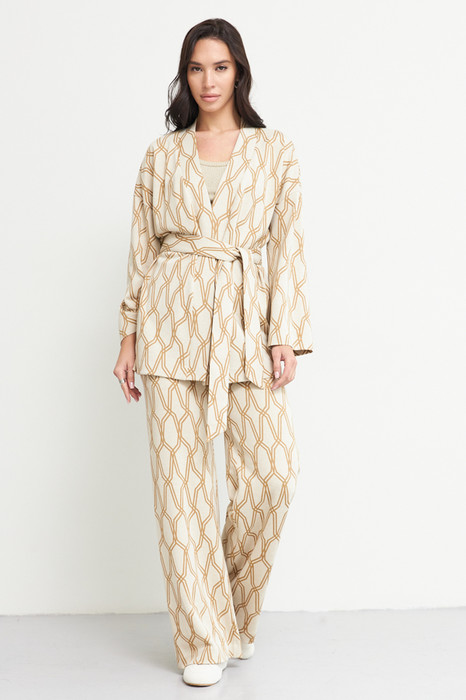 Костюм из эластичного полотна. Брюки прямого силуэта. Пояс с эластичной резинкой. Кардиган свободного силуэта с притачной планкой. Втачной широкий рукав в спущенную пройму. В комплекте пояс из основной ткани.