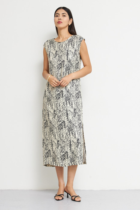 Платье из вискозной ткани с сатиновым блеском. Полуприлегающий силуэт, с разрезом в боковом шве. По среднему шву спинки застёжка на петлю-пуговицу. Круглый вырез горловины и линия проймы окантованы косыми бейками из основной ткани.