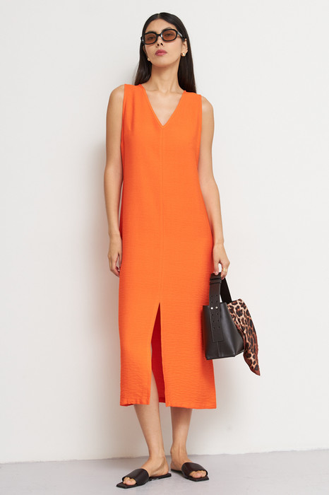 Платье из вискозной ткани с крэш-эффектом полуприлегающего силуэта. По центру передней части изделия выполнен шов, снизу разрез. V-образный вырез горловины и линия проймы оформлены косыми бейками.