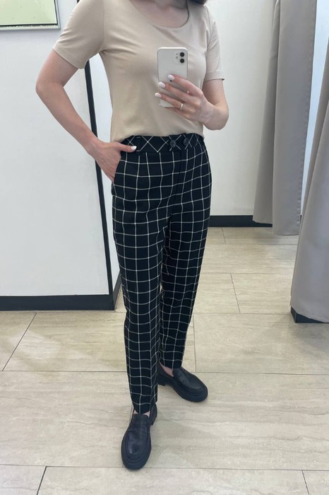 Брюки прямого силуэта, зауженные книзу из костюмной ткани. Застёжка на молнию-гульфик и пуговицу. Карманы с подкройным бочком. Притачной пояс со шлёвками.