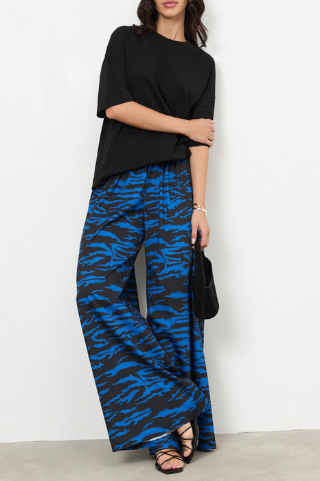 Брюки прямого свободного силуэта из вискозной ткани. Пояс притачной с эластичной резиной, в боковых швах карманы.
