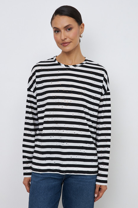 Джемпер из эластичного полотна с перфорацией. Свободный силуэт со спущенной линией плеча и длинным рукавом. Вырез горловины окантован эластичной бейкой. В таблице размеров представлены параметры человека, а не изделия.