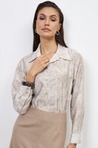 Рубашка свободного силуэта из вискозной ткани с застёжкой на пуговицы. Низ изделия асимметричной длины (спинка удлинена относительно переда) с закруглениями по бокам и разрезами. Рубашечный рукав на манжете с застёжкой на пуговицы. Вырез горловины обработан отложным воротником на стойке. На задней части изделия выполнена кокетка с небольшой складкой. Достоинство этой модели в способности скрыть некоторые недостатки фигуры. Её можно сочетать как с брюками, так и с джинсами.