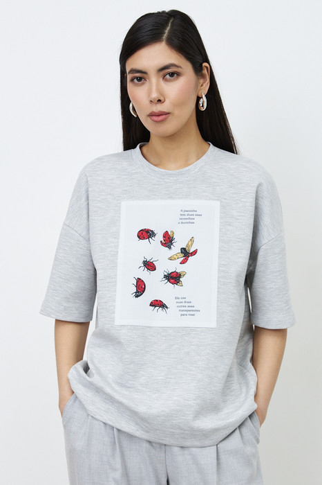 Джемпер свободного силуэта со спущенной линией плеча и рукавом до локтя выполнен из эластичного полотна. Вырез горловины оформлен бейкой из основной ткани. На передней части изделия выполнена аппликация. В таблице размеров представлены параметры человека, а не изделия.