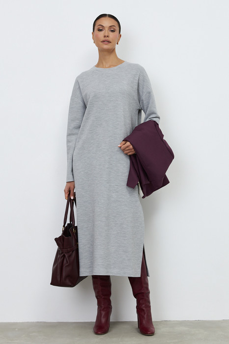 Платье из эластичного полотна свободного силуэта с разрезом в боковом шве. Изделие со спущенной линией плеча и длинным рукавом. Вырез горловины оформлен бейкой из основной ткани. В таблице размеров представлены параметры человека, а не изделия.