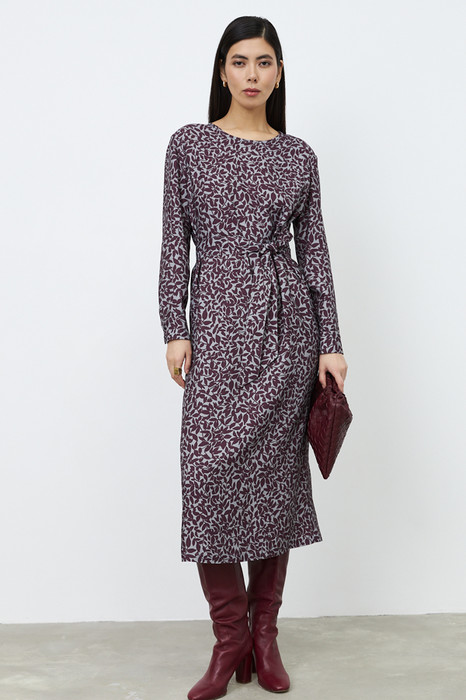 Платье из вискозной ткани полуприлегающего силуэта. Втачной длинный рукав на манжете с застёжкой на пуговицы. На задней части изделия застежка на петлю-пуговицу, снизу выполнен разрез. Круглый вырез горловины оформлен косой бейкой. В комплекте пояс из основной ткани.