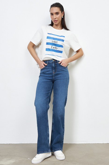Брюки из эластичного денима выполнены по классической джинсовой технологии (варка с эффектом легкого выбеливания). Прямой классический крой. На задней части брюк выполнены накладные карманы, на передней - карманы с подкройным бочком. Притачной пояс со шлёвками. Застёжка на молнию-гульфик и пуговицу.