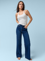 Брюки из денима выполнены по классической джинсовой технологии (варка с эффектом легкого выбеливания). Прямой широкий крой. На задней части брюк выполнены накладные карманы, на передней - карманы с подкройным бочком. Притачной пояс со шлёвками и кулиской. Застёжка на молнию-гульфик и пуговицу.