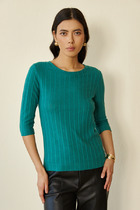 Свитшот из эластичного полотна свободного силуэта. Круглый вырез горловины оформлен бейкой. Рукав реглан с горизонтальным швом в области локтевого сгиба. По низу изделия и рукавов выполнены притачной пояс и манжеты из основной ткани. В таблице размеров представлены параметры человека, а не изделия.