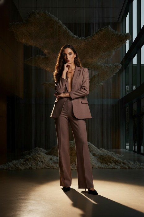 Брюки из костюмной ткани прямого силуэта. Застёжка на молнию-гульфик и пуговицу. В боковых швах выполнены карманы с подкройным бочком. Притачной пояс со шлёвками. На задней половинке брюк карманы в рамку с пуговицей, на поясе вставка с резиной.