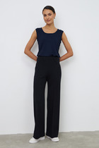 Брюки из костюмной ткани прямого силуэта. На передней половинке изделия выполнены карманы с подкройным бочком, на задней - талиевые вытачки и имитация карманов в рамку. Притачной пояс со шлёвками. Застёжка на молнию-гульфик и пуговицу. Такой крой выгодно подчеркнёт длину ваших ног.