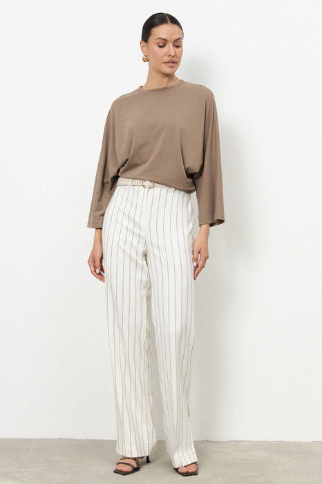 Брюки из костюмной ткани прямого силуэта с разрезами в боковых швах. Застёжка на молнию-гульфик и пуговицу. Притачной пояс со шлёвками. На поясе задней половинке брюк вставка с резиной. Секрет такой модели кроется в безупречно точной посадке по талии и бедрам – ничего лишнего, только конструктивные детали, которые придают четкость линиям силуэта.