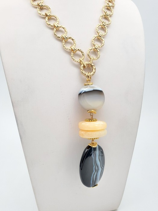 Агат бразильский, агат ботсванский. кальцит желтый, ювелирный сплав. Гальваническое покрытие: золото.
